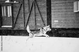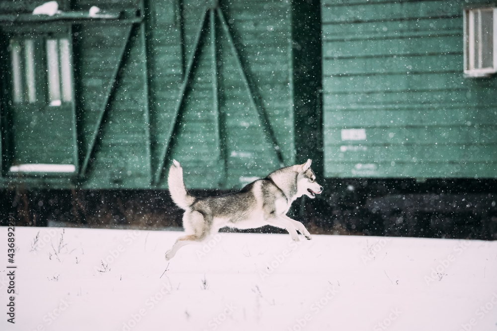 Young Husky Dog Play, Fast Funny Running Outdoor In Snow, Snowdrift Near Railway Carriage. Pet Play In Winter Day