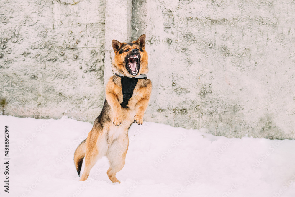 Training Of Purebred German Shepherd Dog In Special Outfit. Alsatian Wolf Dog During Exercise. Attack And Defence. Winter Snowy Day