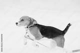 Funny Tricolor Puppy Of English Beagle Playing Running In Snow Snowdrift At Winter Day