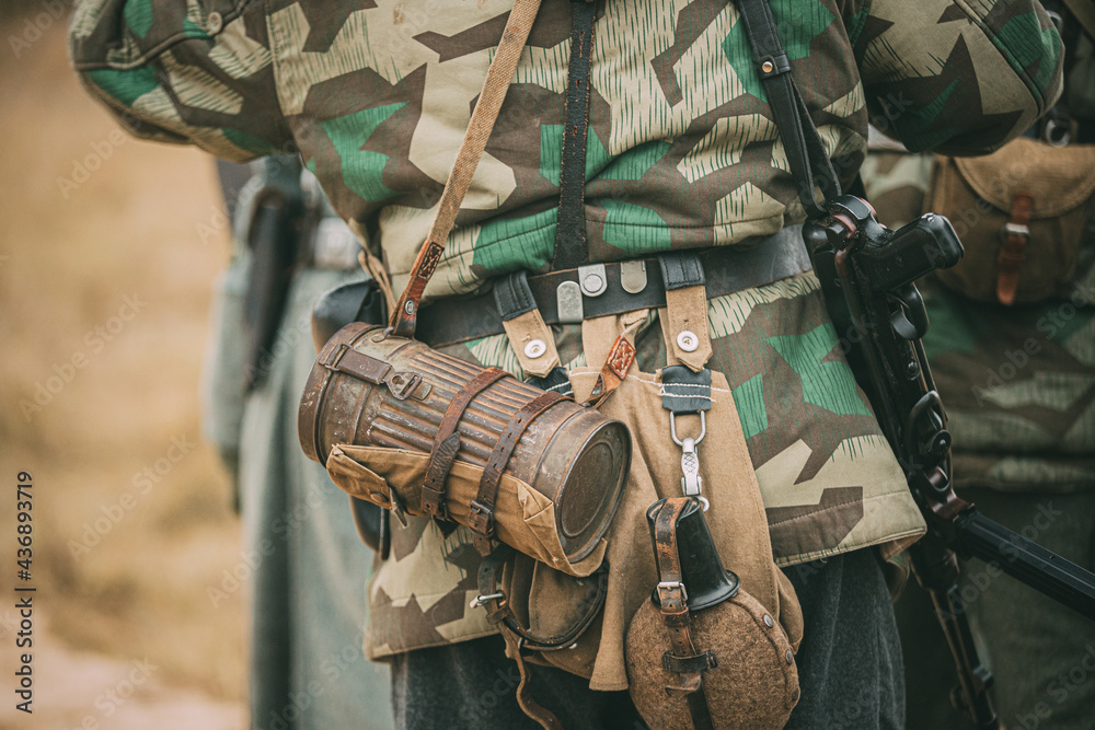 German Wehrmacht Infantry Soldier's Military Equipment Of World War II. Anti-gas Case Or Gas mask Storage On Soldier