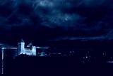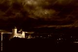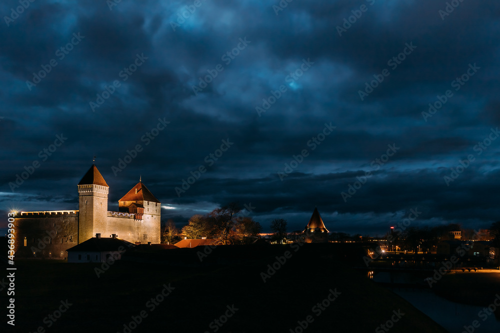 Kuressaare, Saaremaa Island, Estonia. Episcopal Castle In Night. Traditional Medieval Architecture, Famous Attraction Landmark. Old Tower.