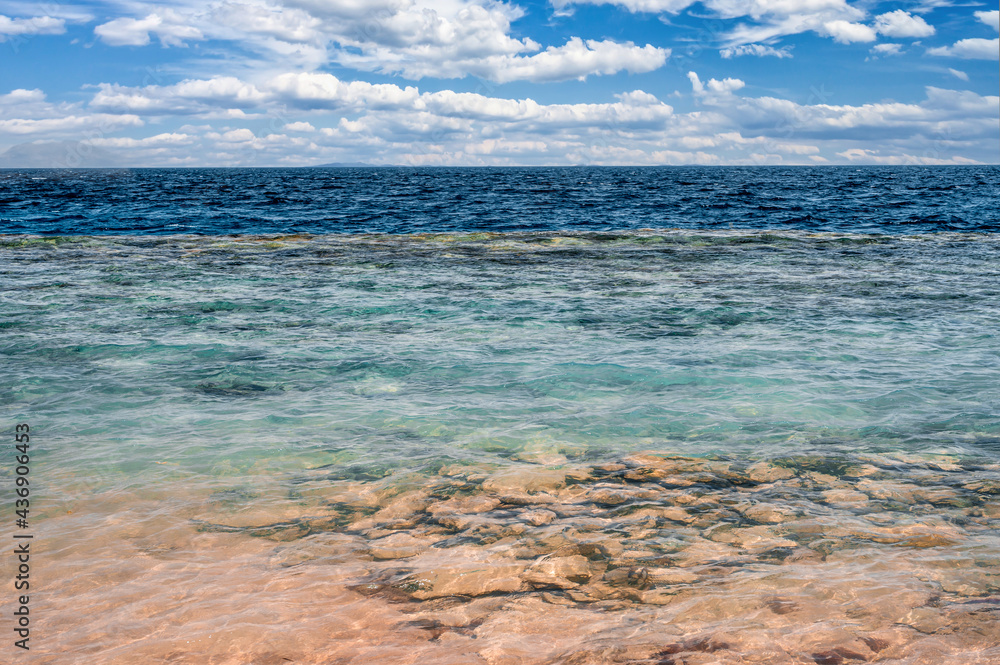 summer vacation, holiday background of a tropical beach and blue sea and white clouds with sun flare.