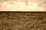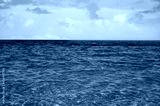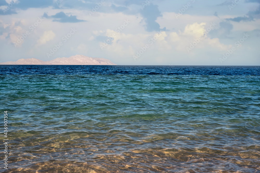 seascape, sea of different colors and shades. From turquoise to blue, the skyline and the island in the distance