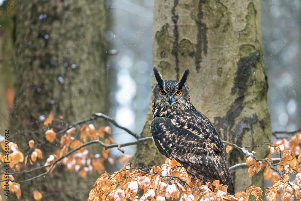 Brown owl is sitting on the tree branch looking at the camera. Horizontally.
