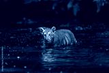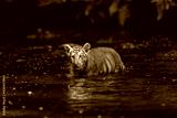 Cute Bengal tiger cub is walking in the river. Horizontally.