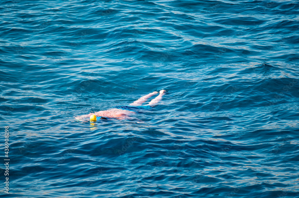 snorkeling concept. man exploring blue sea while snorkeling in summer day. snorkeling Swimming Summer Vacation Concept