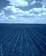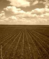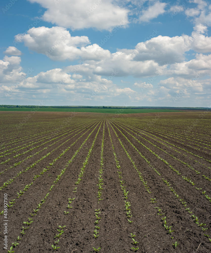 Sugar beet sprouts on a cultivated agricultural field and cloudly sky