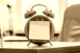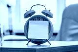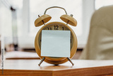 Mechanical alarm clock and paper sticker. Desk clock. Time symbol.