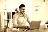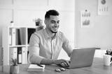 Handsome young Arab businessman working with laptop computer at his desk in office