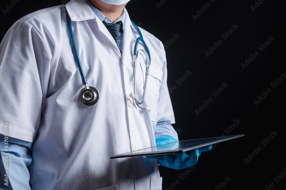 A male doctor standing with a tablet Taken on a black background Concept of technology in medicine