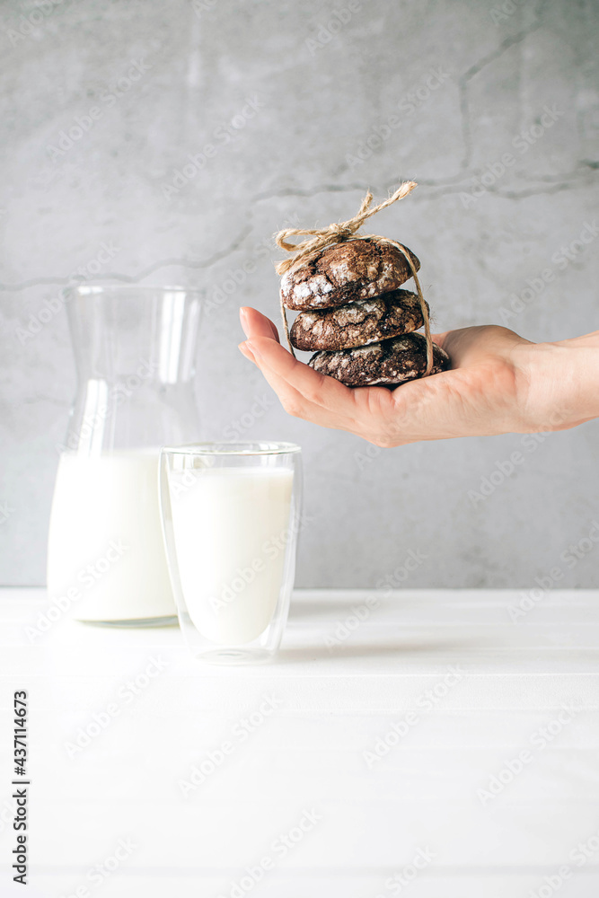 Front view of hand holding freshly baked chocolate cookies and glass of milk on rustic wooden table over gray background. Copy space. Vertical image.