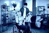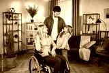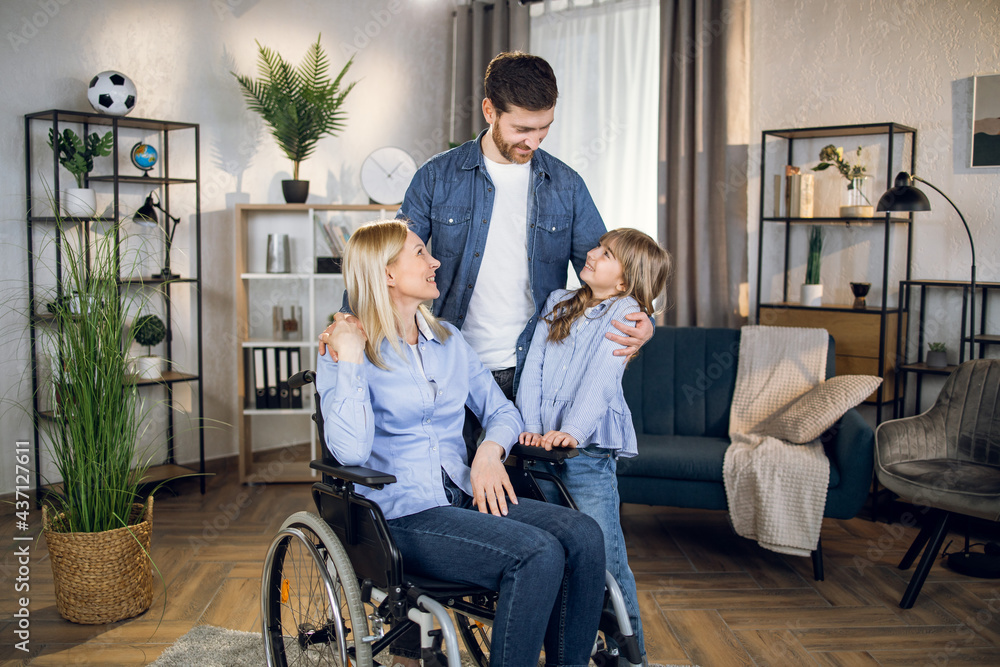 Handsome bearded man embracing his cute daughter and disabled wife at living room. People with special needs. Family support concept.