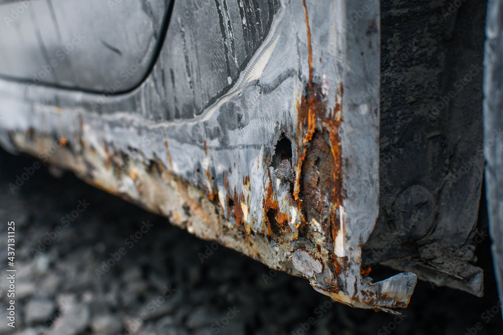 Heavy corrosion or rust appearing on the sides and bottom of the car.