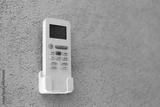 Close-up of remote control of air conditioner standing on holder, on textured wall of grey. Background with copy space.