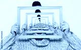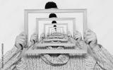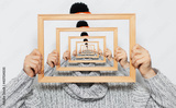 Enigmatic surrealistic optical illusion; portrait of young man holding frame on grey background.