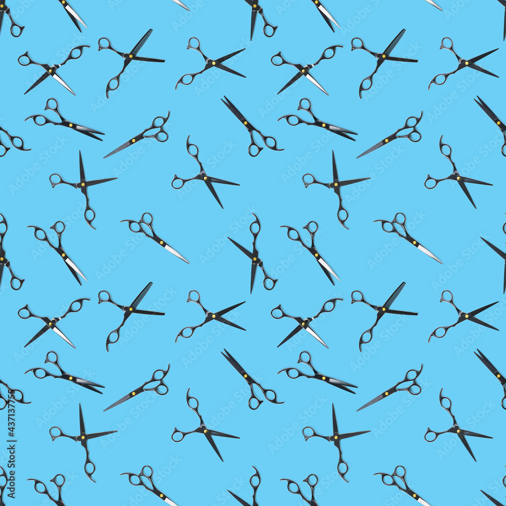Seamless pattern of black scissors. professional hairdresser black scissors isolated on blue. Black barber scissors, close up. pop art background, for prints or posters