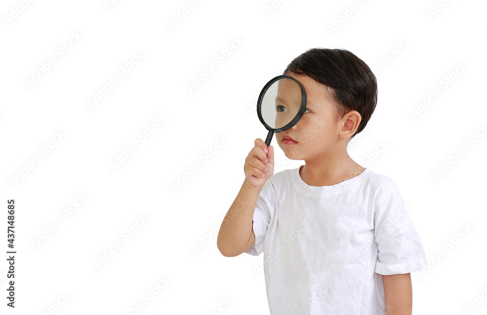 Asian little baby boy looking through a magnifying glass to beside isolated on white background with copy space