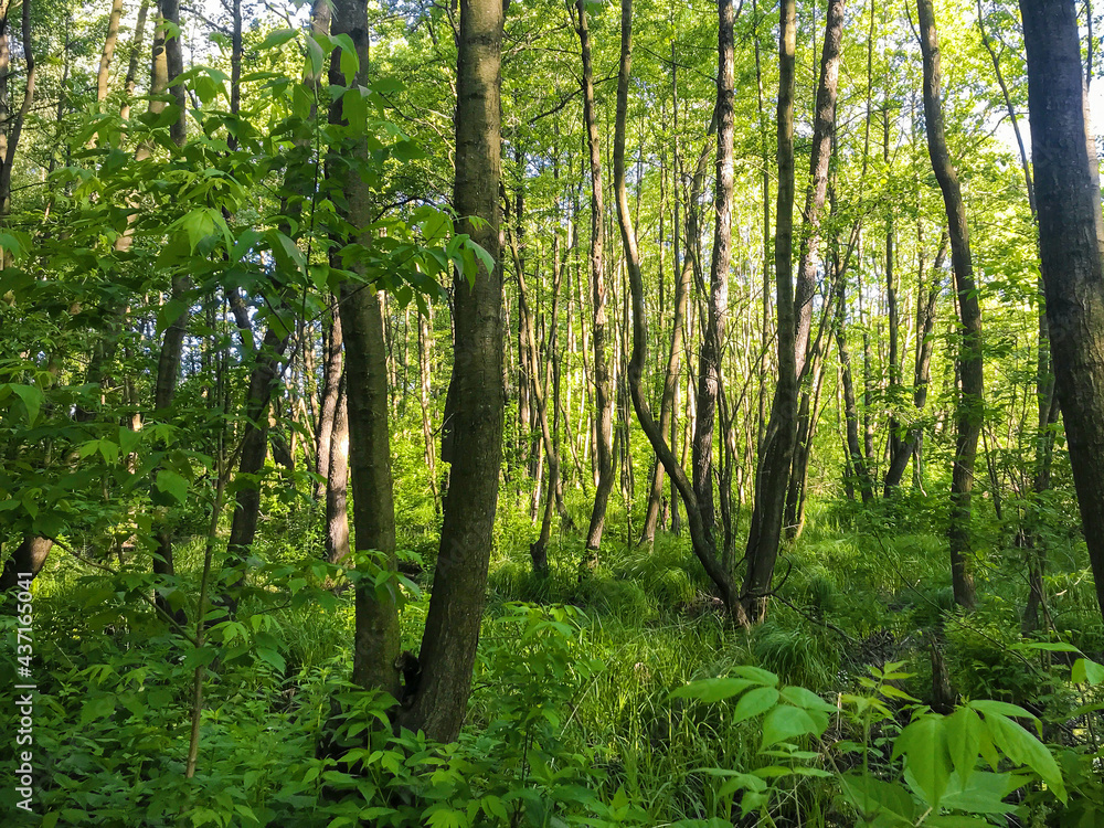 Forest landscape. Green Forest. Birch, oak and other trees.