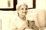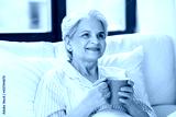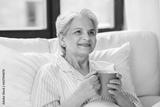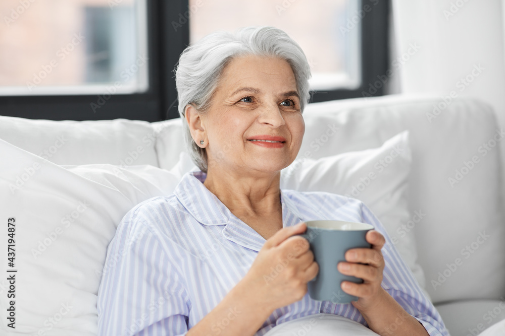 morning, old age and people concept - happy smiling senior woman in pajamas with cup of coffee sitting on bed at home bedroom