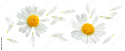 Chamomile or camomile with flying petals set isolated on white background. Daisy flower