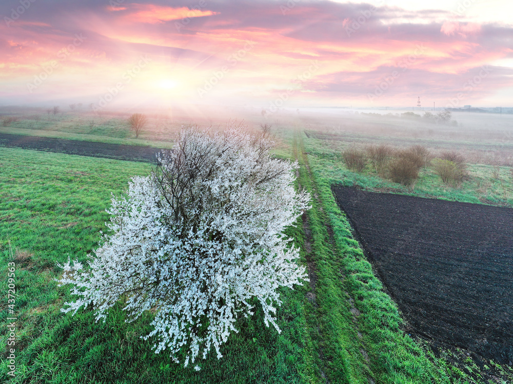 Aerial drone photo of flowering fields
