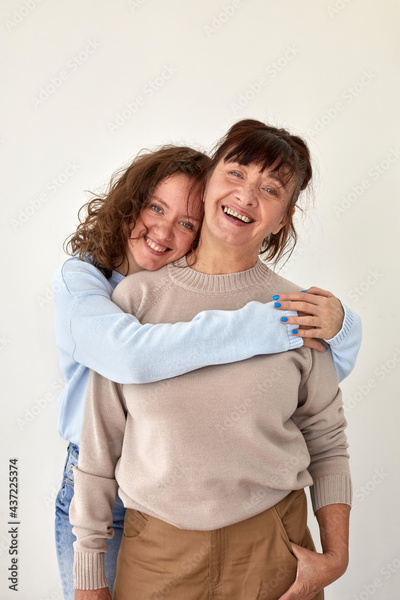 Young woman hugs happy mature smiling lady wearing casual clothing stand together in apartment room with beige wall closeup