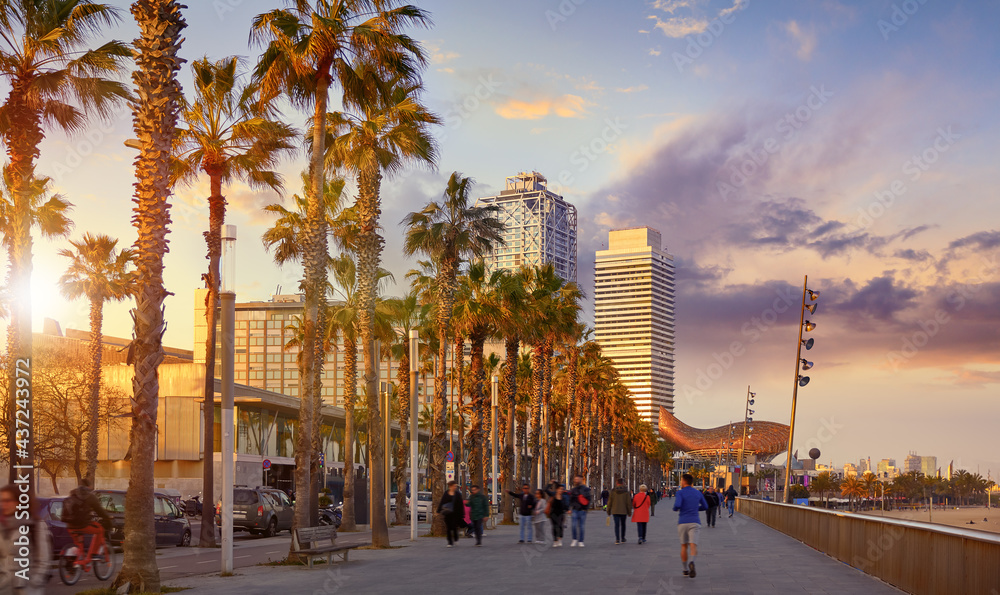 Barcelona, Spain. Road for public transport and alley of palm trees. Sunny summer day. Urban street landscape with bus station.