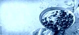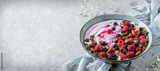 Healthy breakfast bowl with yogurt, granola, muesli, seeds, frozen raspberries, blueberries, nuts in blue ceramics on light background. Healthy food, detox smoothy, vegetarian nutrition, close up