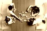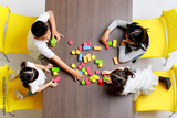 Top view shot group of Asian little cute intelligent kindergarten schoolboy and schoolgirls sitting on yellow chairs playing colorful brick toy together on wooden table at pre elementary school