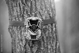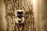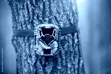 Trail camera for wildlife monitoring attached to a tree with green strap. Hidden digital trap with motion pir sensor and infrared flash used for scientific research.