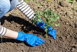 A person in rubber gloves plants a young tomato plant in the ground.
