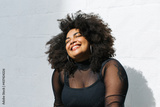 Cheerful female model in black stylish wear