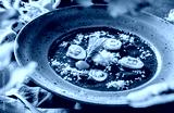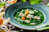 Cream soup with spinach, quail eggs and parmesan cheese in plate on wooden background. Healthy vegan food, clean eating, dieting, close up