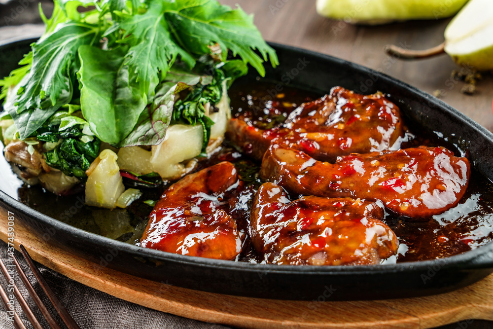 Fried prawns in a spicy sweet sauce with salad spinach and pineapple in a pan on wooden table. Healthy seafood, close up, selective focus
