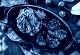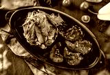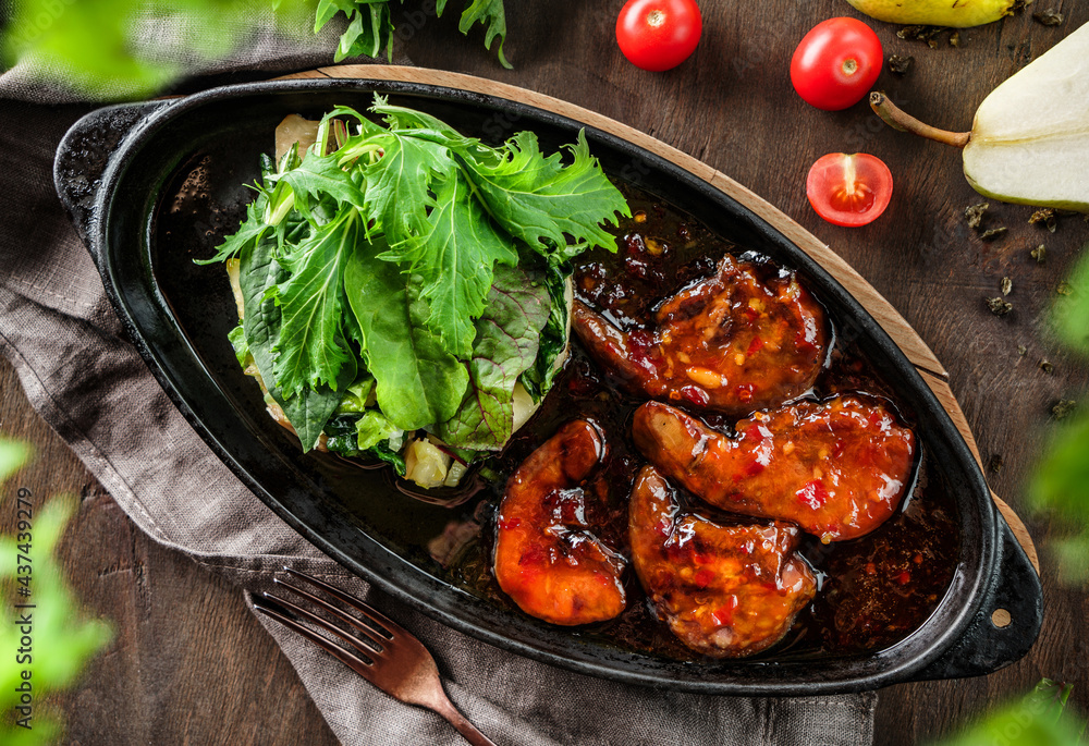 Fried prawns in a spicy sweet sauce with salad spinach and pineapple in a pan on wooden table. Healthy seafood, top view