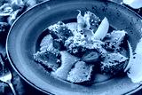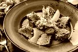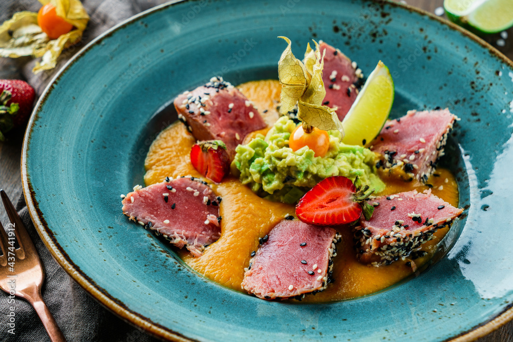 Fillet of tuna with lentil and avocado puree in plate on wooden background. Healthy food, seafood cuisine, top view