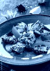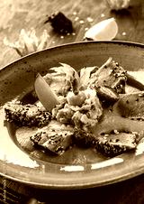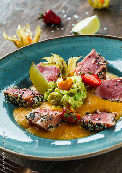 Fillet of tuna with lentil and avocado puree in plate on wooden background. Healthy food, seafood cuisine, close up