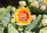 Top view of one beautiful orange and yellow Prickly Pear cacti flower with a bee vigorously collecting pollen from the deep center