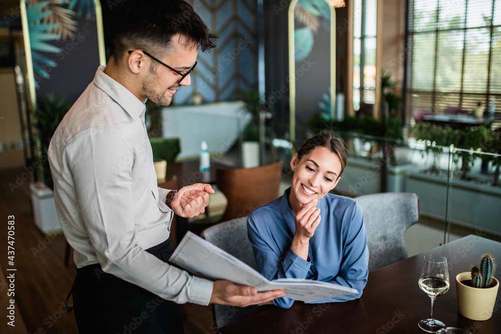 Hansome young waiter showing menu to beautiful female customer in restaurant.