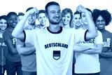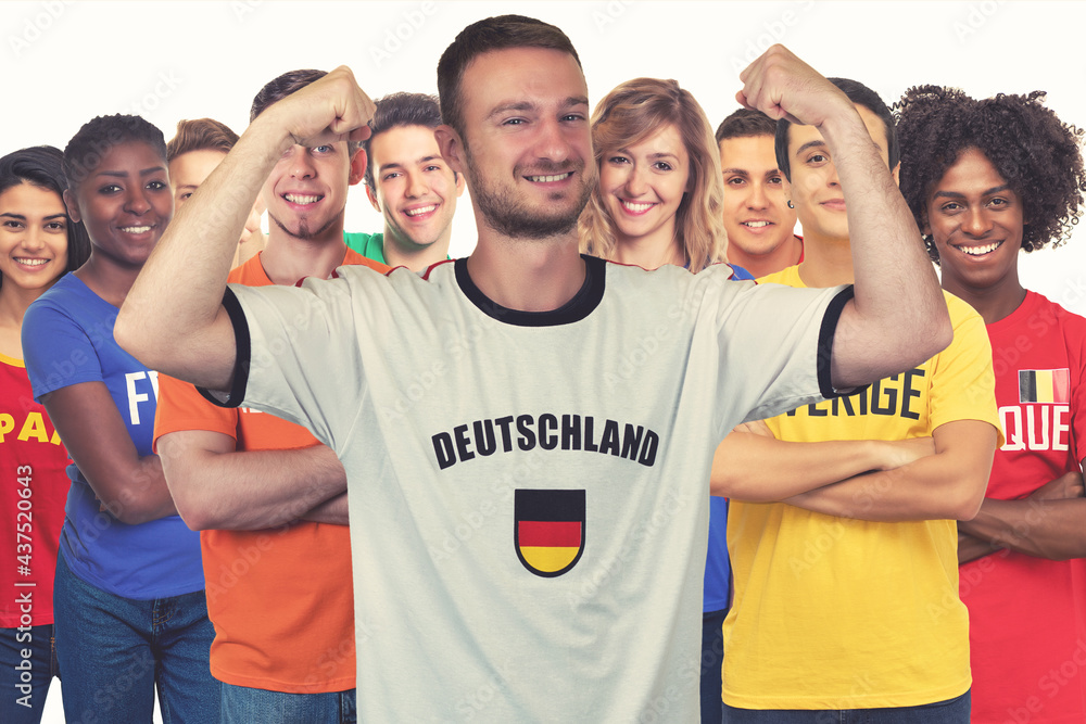 Jubelnder deutscher Fussball Fan mit Fans aus anderen Ländern