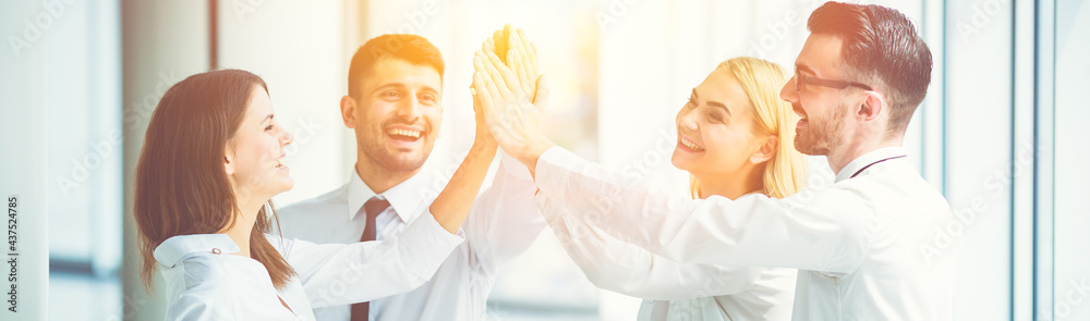 The happy business people greeting on the sun background