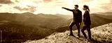 The couple gesturing on the mountain with a picturesque cloudscape
