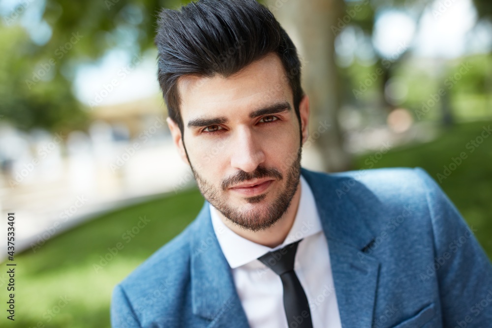 Outdoor closeup portrait of handsome young businessman looking at camera.