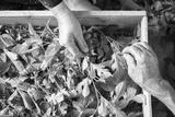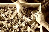 Top view of senior hands about to feed silkworms with fresh mulberry leaves in a traditional way