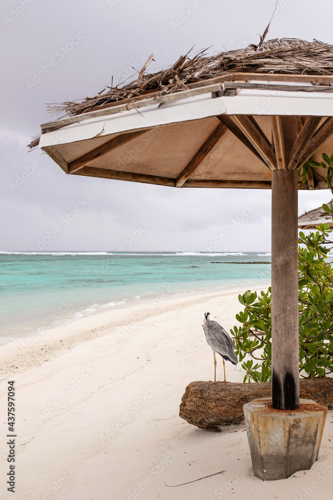 the wild grey heron is an inhabitant of the Maldives on the coast of the Indian Ocean