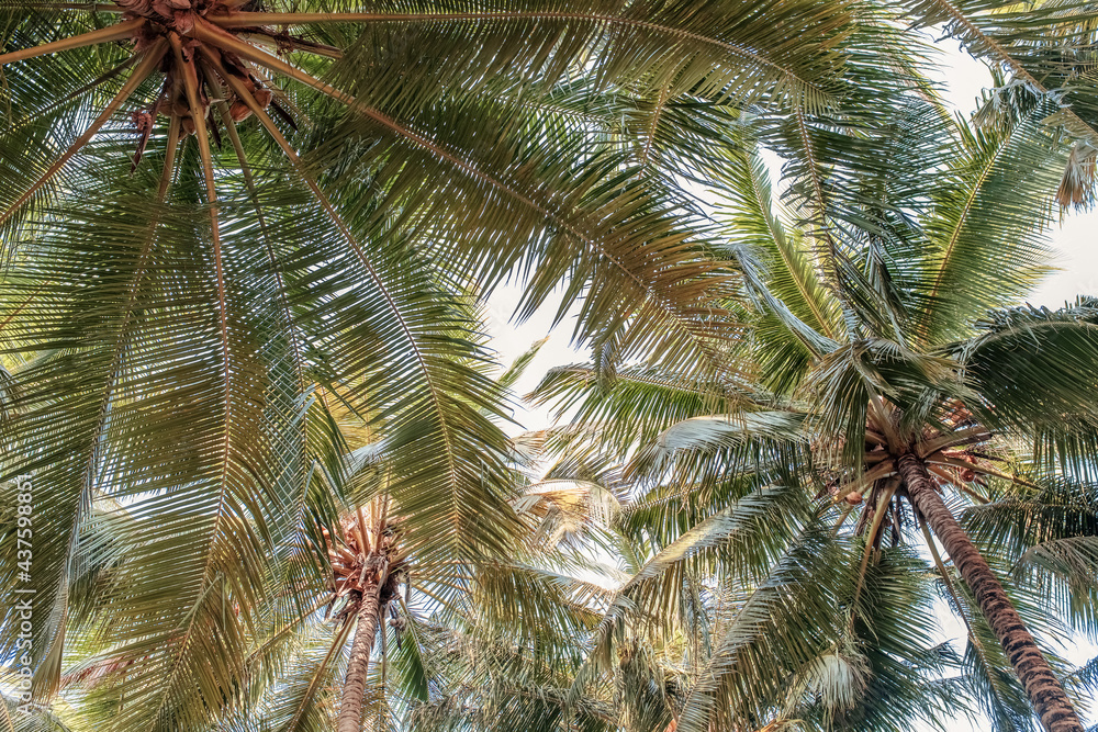 wide, lush crown of giant green coconut palm leaves, bottom view