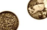 Natural raw dog food and kibble in bowls. Natural dog food or dry food.