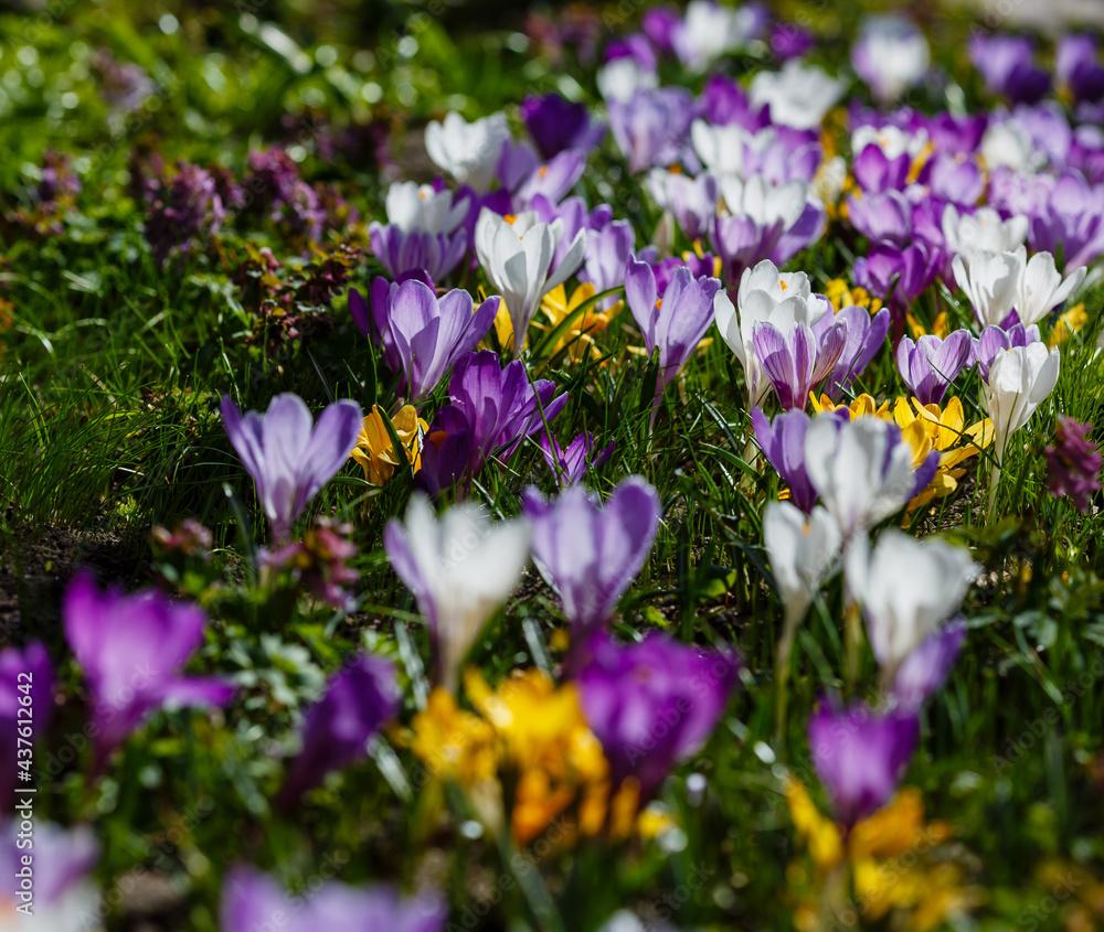 Beautiful spring background with close-up of a group of blooming purple, yellow, white crocus flowers in spring garden. Growing early-flowering bulbous plants