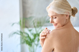 Back view of naked gorgeous middle aged 50s woman applying moisturizing body lotion after shower. Advertising of bodycare spa procedures, antiage sun protection treatment products concept.