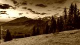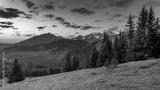 Widok na panoramę Tatr Wysokich z Rusinowej Polany w złotej godzinie
